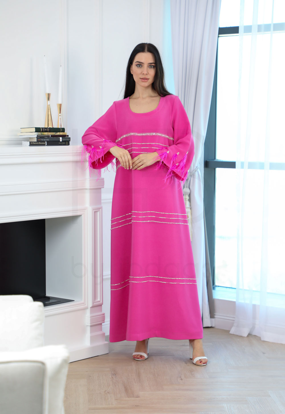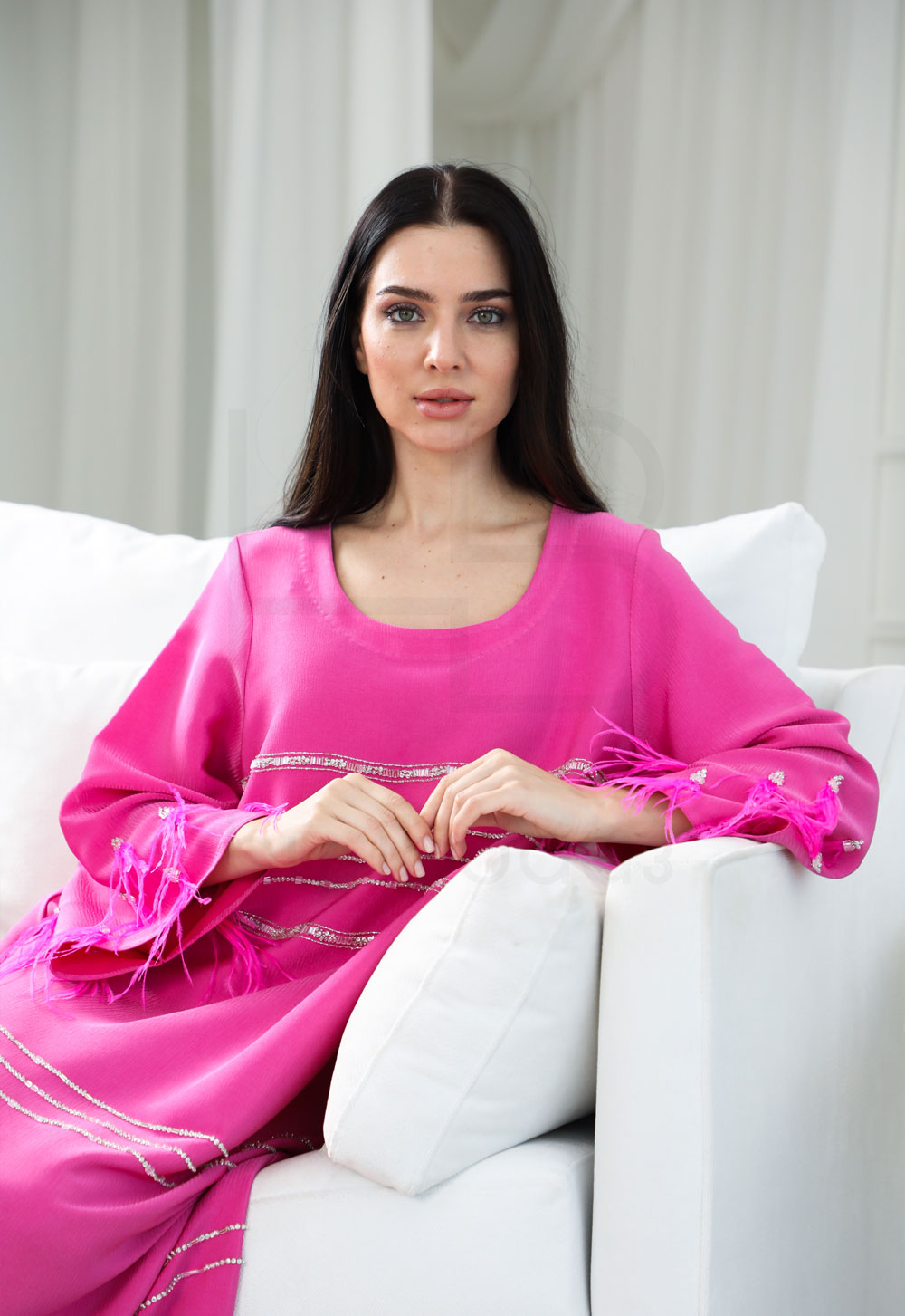 This striking kaftan features a vibrant fuchsia hue with a clean, modern silhouette enhanced by delicate embellishments. Horizontal bands of shimmering beadwork run across the chest and hem, adding texture and elegance to the design. The wide sleeves are adorned with soft, flowing tassels that create movement and a touch of playful charm.