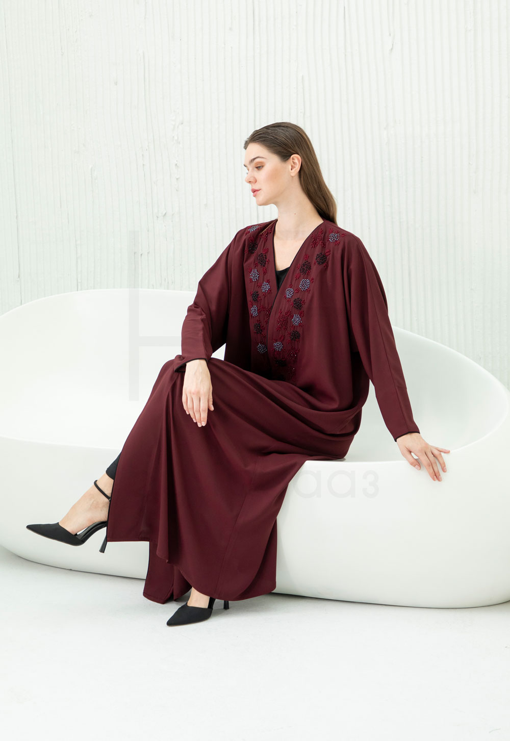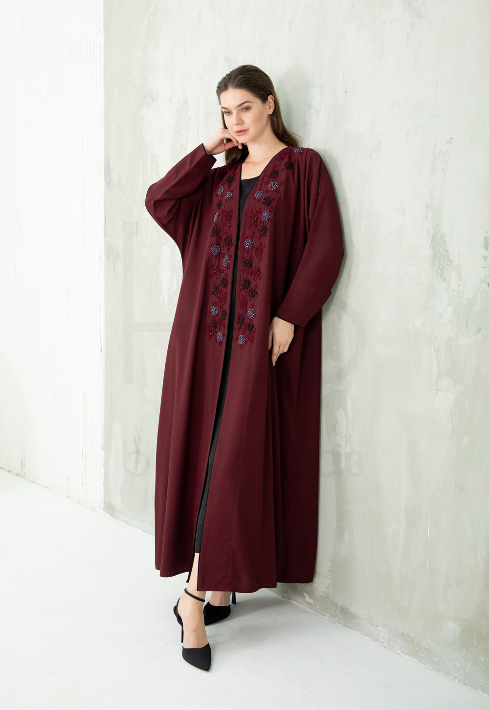With its clean lines and luxurious detailing, this abaya blends modern style with traditional craftsmanship — ideal for formal occasions, evening wear, or as a statement piece that radiates timeless beauty.