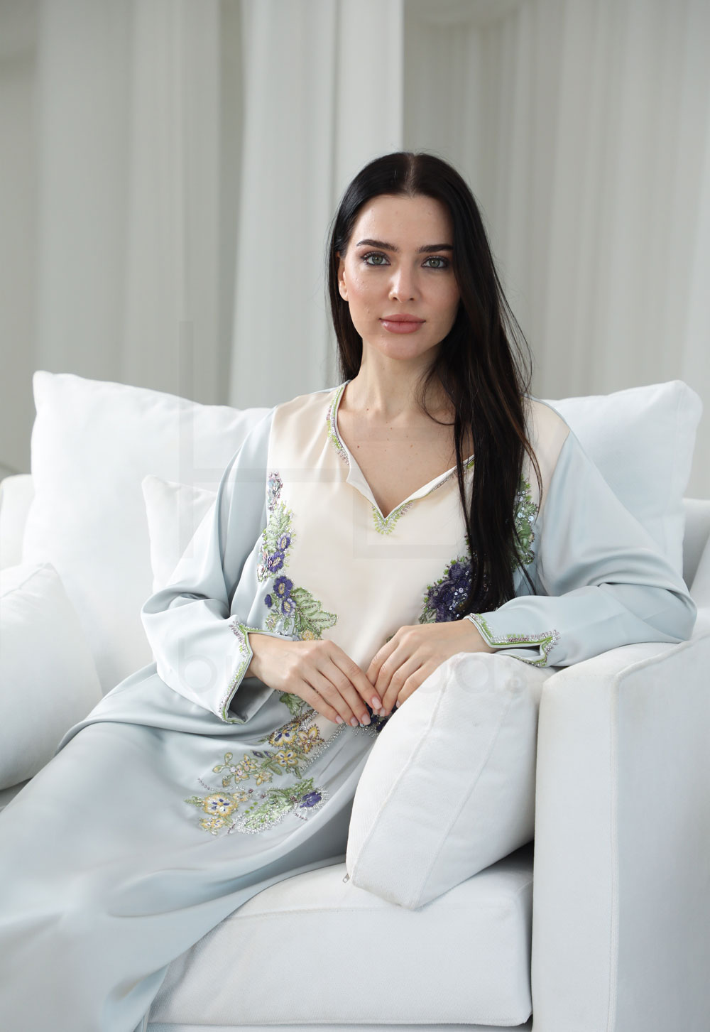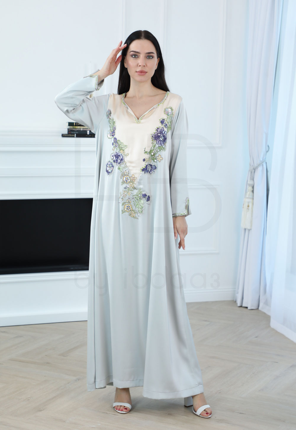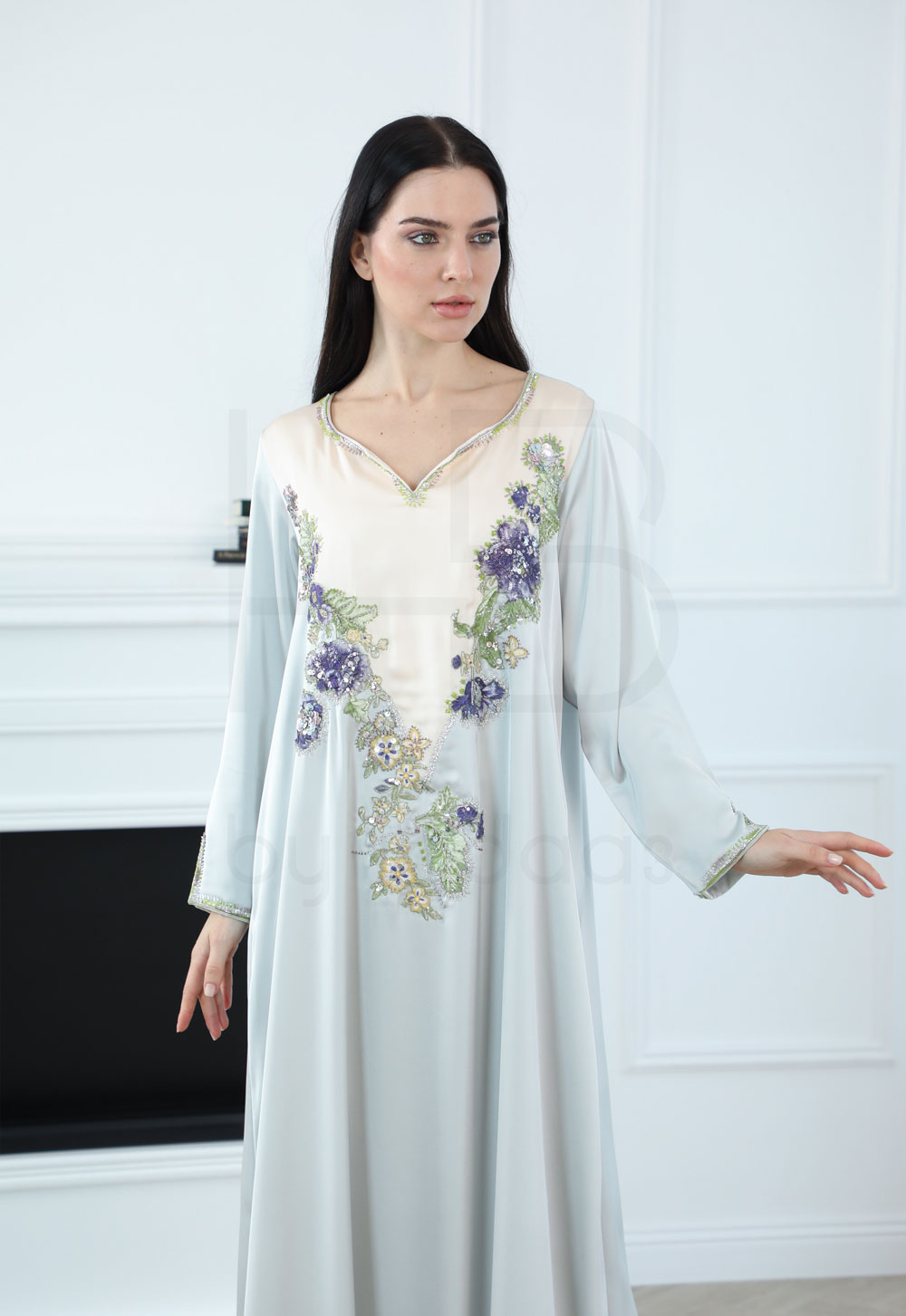 Perfect for special occasions or elegant loungewear, this kaftan blends modern simplicity with traditional craftsmanship, making it a timeless addition to any wardrobe.