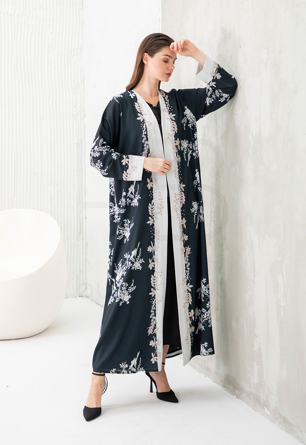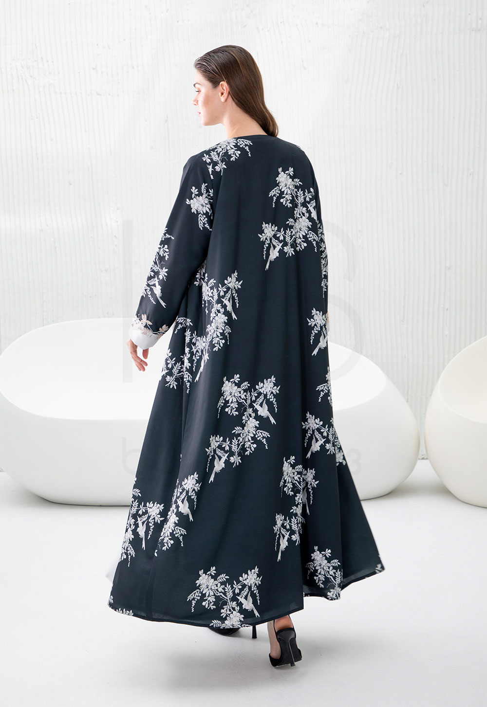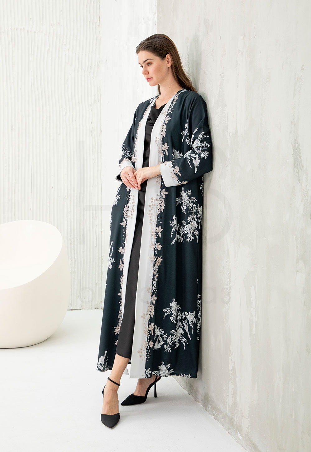 With its harmonious blend of color and motif, this abaya combines modern simplicity with traditional charm — ideal for formal occasions, evening wear, or as a timeless piece that brings quiet beauty to any look.