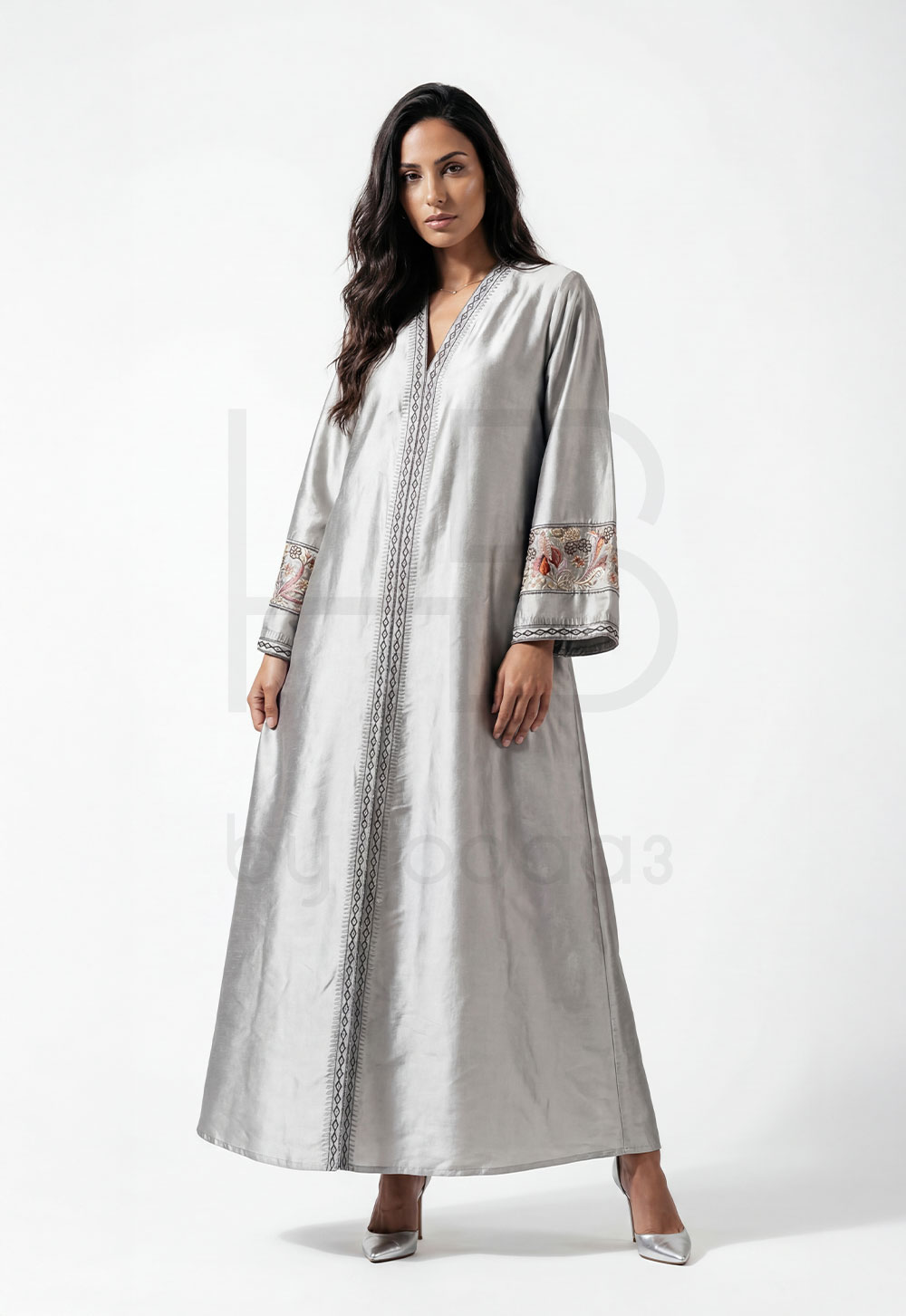 Luxurious silver satin open abaya featuring a deep V-neckline and a fluid, floor-length cut. Accented with vertical geometric embroidery down the front and detailed floral cuffs in warm tones.
